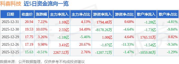 证券之星消息,截至2025年12月31日收盘,科森科技(603626)报收于20.94元,上涨7.22%,换手率23.1%,成交量128.15万手,成交额26.54亿元。