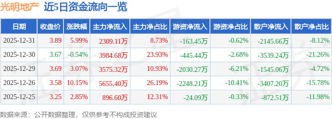 证券之星消息,截至2025年12月31日收盘,光明地产(600708)报收于3.89元,上涨5.99%,换手率3.08%,成交量68.6万手,成交额2.64亿元。