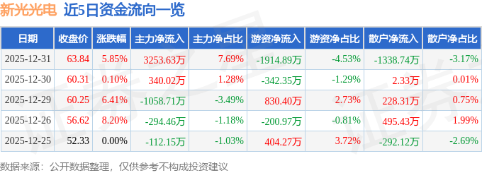 证券之星消息,截至2025年12月31日收盘,新光光电(688011)报收于63.84元,上涨5.85%,换手率6.76%,成交量6.76万手,成交额4.23亿元。