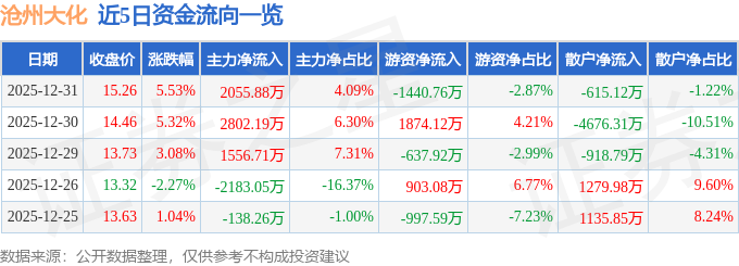 证券之星消息,截至2025年12月31日收盘,沧州大化(600230)报收于15.26元,上涨5.53%,换手率8.13%,成交量33.66万手,成交额5.03亿元。