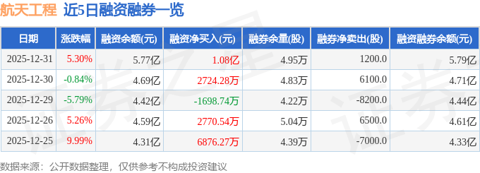 证券之星消息,截至2025年12月31日收盘,航天工程(603698)报收于38.75元,上涨5.3%,换手率10.84%,成交量58.12万手,成交额22.09亿元。