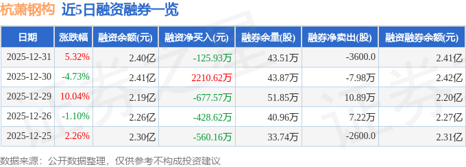 证券之星消息,截至2025年12月31日收盘,杭萧钢构(600477)报收于2.97元,上涨5.32%,换手率9.71%,成交量230.05万手,成交额6.82亿元。
