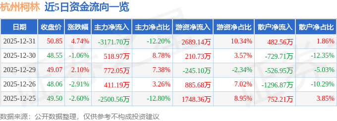 证券之星消息,截至2025年12月31日收盘,杭州柯林(688611)报收于50.85元,上涨4.74%,换手率3.44%,成交量5.28万手,成交额2.6亿元。