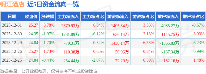 证券之星消息,截至2025年12月31日收盘,锦江酒店(600754)报收于25.27元,上涨3.78%,换手率1.87%,成交量16.91万手,成交额4.23亿元。