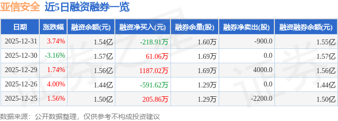 证券之星消息,截至2025年12月31日收盘,亚信安全(688225)报收于19.4元,上涨3.74%,换手率1.94%,成交量7.74万手,成交额1.48亿元。