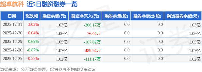 超卓航科融资融券信息显示,融资方面,当日融资买入977.89万元,融资偿还1244.06万元,融资净偿还266.17万元。融券方面,融券卖出0.0股,融券偿还0.0股,融券余量0.0股,融券余额0.0万元。融资融券余额1.03亿元。