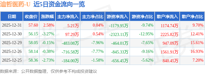 证券之星消息,截至2025年12月31日收盘,迪哲医药(688192)报收于57.6元,上涨2.58%,换手率0.47%,成交量2.13万手,成交额1.21亿元。