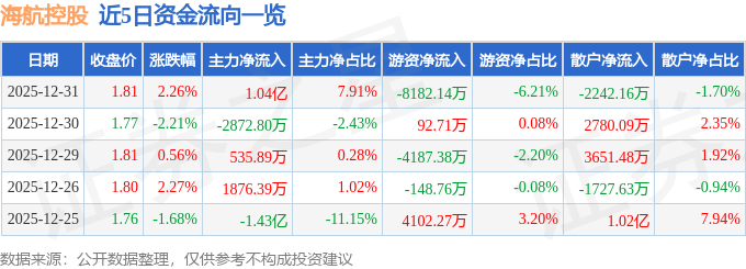 证券之星消息,截至2025年12月31日收盘,海航控股(600221)报收于1.81元,上涨2.26%,换手率1.72%,成交量735.77万手,成交额13.17亿元。