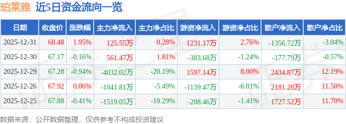 证券之星消息,截至2025年12月31日收盘,珀莱雅(603605)报收于68.48元,上涨1.95%,换手率1.64%,成交量6.51万手,成交额4.47亿元。