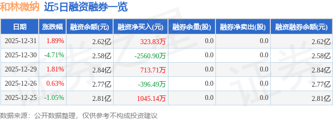 和林微纳融资融券信息显示,融资方面,当日融资买入3933.83万元,融资偿还3609.99万元,融资净买入323.83万元。融券方面,融券卖出0.0股,融券偿还0.0股,融券余量0.0股,融券余额0.0万元。融资融券余额2.62亿元。