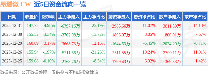 证券之星消息,截至2025年12月31日收盘,昂瑞微(688790)报收于147.78元,下跌4.98%,换手率14.92%,成交量1.8万手,成交额2.7亿元。