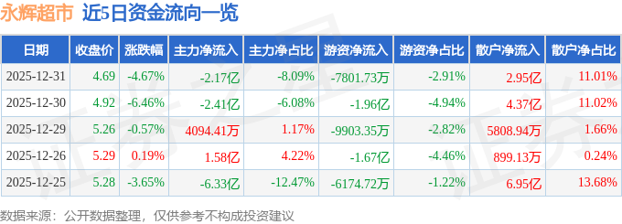 证券之星消息,截至2025年12月31日收盘,永辉超市(601933)报收于4.69元,下跌4.67%,换手率6.21%,成交量563.36万手,成交额26.79亿元。