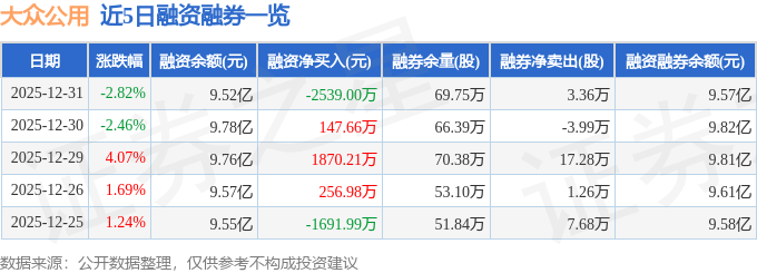 大众公用融资融券信息显示,融资方面,当日融资买入7675.67万元,融资偿还1.02亿元,融资净偿还2539.0万元。融券方面,融券卖出5.82万股,融券偿还2.46万股,融券余量69.75万股,融券余额456.17万元。融资融券余额9.57亿元。