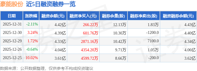 证券之星消息,截至2025年12月31日收盘,豪能股份(603809)报收于14.35元,下跌2.11%,换手率7.55%,成交量69.47万手,成交额9.92亿元。