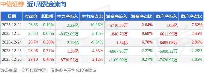 证券之星消息,截至2025年12月26日收盘,中信证券(600030)报收于29.1元,较上周的28.68元上涨1.46%。本周,中信证券12月26日盘中最高价报29.4元。12月24日盘中最低价报28.55元。中信证券当前最新总市值4254.98亿元,在证券板块市值排名1/50,在两市A股市值排名31/5181。