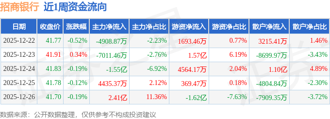 资金流向数据方面,本周招商银行主力资金合计净流入1115.71万元,游资资金合计净流入6124.99万元,散户资金合计净流出7240.7万元。本周资金流向一览见下表: