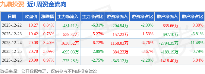 资金流向数据方面,本周九鼎投资主力资金合计净流入274.77万元,游资资金合计净流入1351.82万元,散户资金合计净流出1626.59万元。本周资金流向一览见下表: