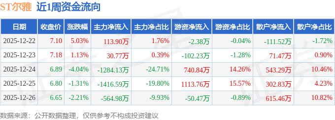 资金流向数据方面,本周ST尔雅主力资金合计净流出3121.04万元,游资资金合计净流入1699.51万元,散户资金合计净流入1421.53万元。本周资金流向一览见下表: