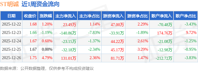 资金流向数据方面,本周ST明诚主力资金合计净流出41.69万元,游资资金合计净流入184.19万元,散户资金合计净流出142.5万元。本周资金流向一览见下表: