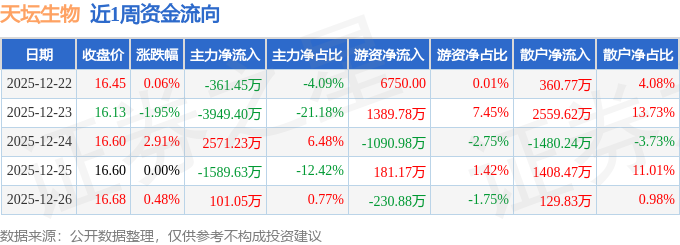 沪深股通持股方面,截止2025年12月26日收盘,天坛生物沪股通持股数为5482.39万股,占流通股比为277.0%。