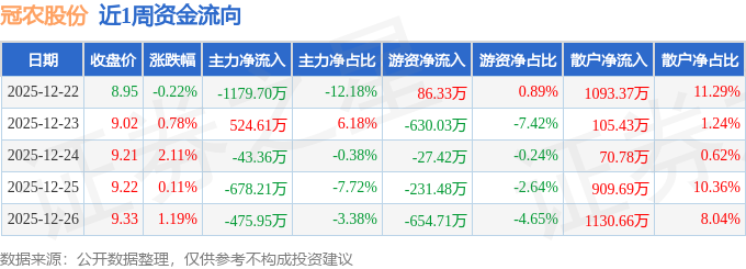 资金流向数据方面,本周冠农股份主力资金合计净流出1852.62万元,游资资金合计净流出1457.32万元,散户资金合计净流入3309.94万元。本周资金流向一览见下表: