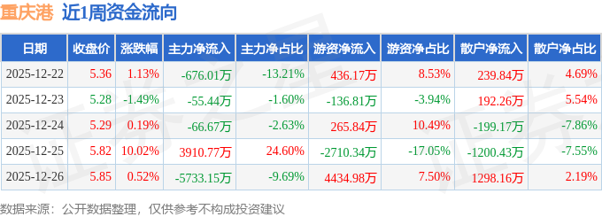 资金流向数据方面,本周重庆港主力资金合计净流出2620.5万元,游资资金合计净流入2289.85万元,散户资金合计净流入330.66万元。本周资金流向一览见下表: