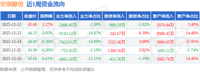 资金流向数据方面,本周安琪酵母主力资金合计净流出2.41亿元,游资资金合计净流入1817.45万元,散户资金合计净流入2.23亿元。本周资金流向一览见下表: