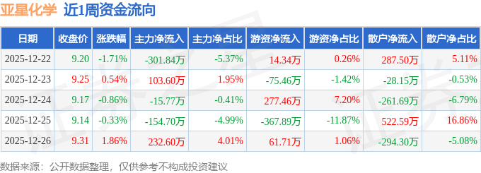 资金流向数据方面,本周亚星化学主力资金合计净流出136.11万元,游资资金合计净流出89.84万元,散户资金合计净流入225.95万元。本周资金流向一览见下表: