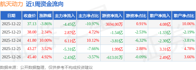 沪深股通持股方面,截止2025年12月26日收盘,航天动力沪股通持股数为286.28万股,占流通股比为45.0%。