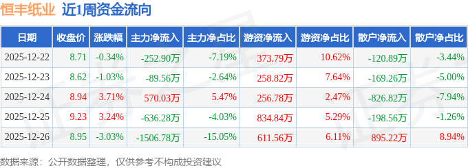 资金流向数据方面,本周恒丰纸业主力资金合计净流出1915.48万元,游资资金合计净流入2335.79万元,散户资金合计净流出420.31万元。本周资金流向一览见下表: