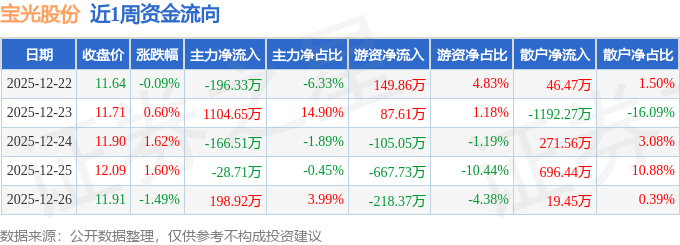 资金流向数据方面,本周宝光股份主力资金合计净流入912.02万元,游资资金合计净流出753.68万元,散户资金合计净流出158.34万元。本周资金流向一览见下表: