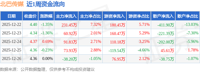 资金流向数据方面,本周北巴传媒主力资金合计净流入419.94万元,游资资金合计净流入408.5万元,散户资金合计净流出828.43万元。本周资金流向一览见下表: