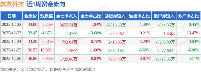 资金流向数据方面,本周航发科技主力资金合计净流入9363.31万元,游资资金合计净流出751.26万元,散户资金合计净流出8612.05万元。本周资金流向一览见下表: