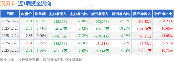 资金流向数据方面,本周瑞贝卡主力资金合计净流出1318.81万元,游资资金合计净流出1818.66万元,散户资金合计净流入3137.48万元。本周资金流向一览见下表: