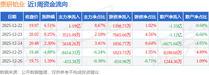 资金流向数据方面,本周贵研铂业主力资金合计净流入1.22亿元,游资资金合计净流入1.11亿元,散户资金合计净流出2.34亿元。本周资金流向一览见下表: