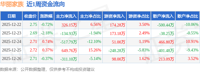 资金流向数据方面,本周华丽家族主力资金合计净流入12.09万元,游资资金合计净流入248.19万元,散户资金合计净流出260.28万元。本周资金流向一览见下表: