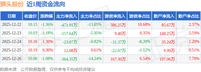 资金流向数据方面,本周狮头股份主力资金合计净流出1005.7万元,游资资金合计净流入529.5万元,散户资金合计净流入476.2万元。本周资金流向一览见下表: