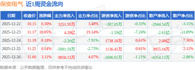 资金流向数据方面,本周保变电气主力资金合计净流入2.66亿元,游资资金合计净流出1.6亿元,散户资金合计净流出1.06亿元。本周资金流向一览见下表: