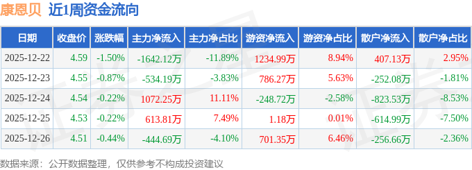 资金流向数据方面,本周康恩贝主力资金合计净流出934.95万元,游资资金合计净流入2475.07万元,散户资金合计净流出1540.13万元。本周资金流向一览见下表: