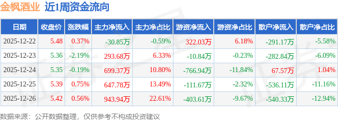 资金流向数据方面,本周金枫酒业主力资金合计净流入2553.91万元,游资资金合计净流出971.04万元,散户资金合计净流出1582.87万元。本周资金流向一览见下表: