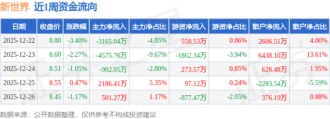 证券之星消息,截至2025年12月26日收盘,新世界(600628)报收于8.45元,较上周的9.11元下跌7.24%。本周,新世界12月22日盘中最高价报9.18元。12月26日盘中最低价报8.32元。新世界当前最新总市值50.84亿元,在一般零售板块市值排名36/58,在两市A股市值排名3316/5181。