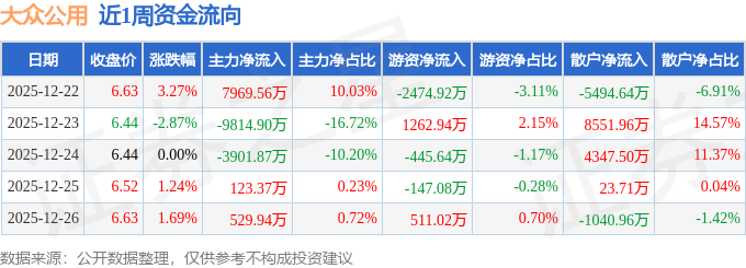 资金流向数据方面,本周大众公用主力资金合计净流出5093.9万元,游资资金合计净流出1293.66万元,散户资金合计净流入6387.57万元。本周资金流向一览见下表:
