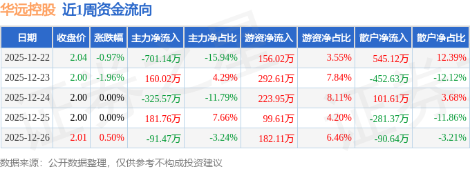 资金流向数据方面,本周华远控股主力资金合计净流出776.4万元,游资资金合计净流入954.3万元,散户资金合计净流出177.91万元。本周资金流向一览见下表: