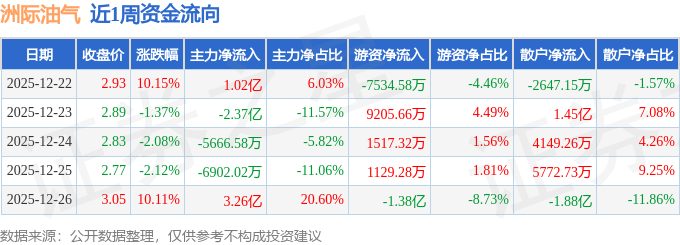 证券之星消息,截至2025年12月26日收盘,洲际油气(600759)报收于3.05元,较上周的2.66元上涨14.66%。本周,洲际油气12月23日盘中最高价报3.06元。12月22日盘中最低价报2.66元。本周共计2次涨停收盘,无跌停收盘情况。洲际油气当前最新总市值129.45亿元,在油气开采板块市值排名3/4,在两市A股市值排名1506/5181。
