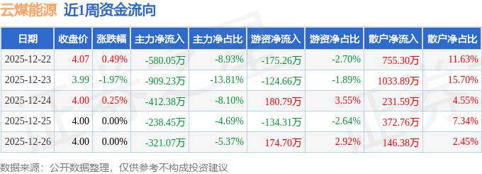 资金流向数据方面,本周云煤能源主力资金合计净流出2461.17万元,游资资金合计净流出78.74万元,散户资金合计净流入2539.92万元。本周资金流向一览见下表: