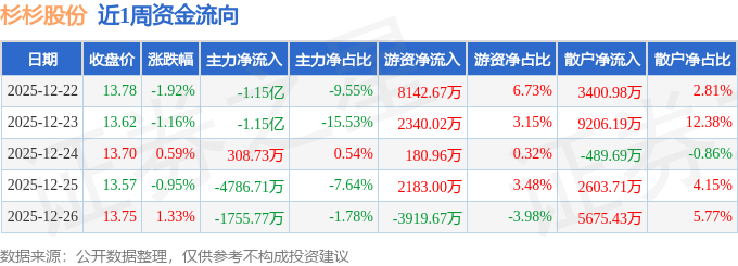 证券之星消息,截至2025年12月26日收盘,杉杉股份(600884)报收于13.75元,较上周的14.05元下跌2.14%。本周,杉杉股份12月22日盘中最高价报14.29元。12月25日盘中最低价报13.4元。杉杉股份当前最新总市值303.9亿元,在电池板块市值排名18/95,在两市A股市值排名635/5181。