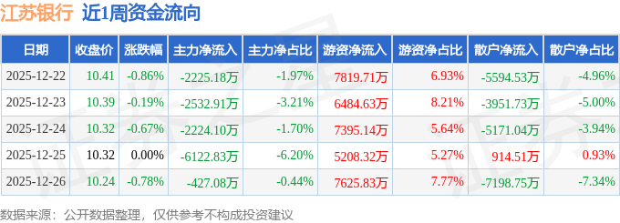 沪深股通持股方面,截止2025年12月26日收盘,江苏银行沪股通持股数为9.06亿股,占流通股比为494.0%。