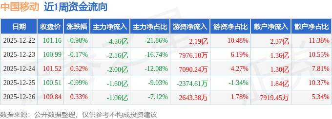 证券之星消息,截至2025年12月26日收盘,中国移动(600941)报收于100.84元,较上周的102.16元下跌1.29%。本周,中国移动12月22日盘中最高价报102.26元。12月24日盘中最低价报100.1元,股价触及近一年最低点。中国移动当前最新总市值21868.73亿元,在通信服务板块市值排名1/39,在两市A股市值排名4/5181。