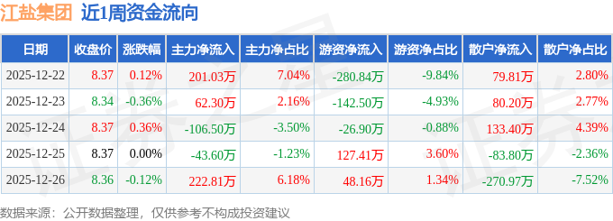 资金流向数据方面,本周江盐集团主力资金合计净流入336.03万元,游资资金合计净流出274.68万元,散户资金合计净流出61.35万元。本周资金流向一览见下表: