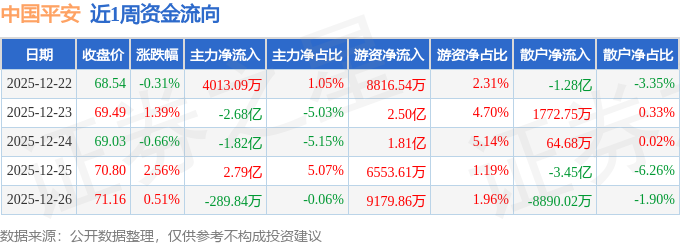 资金流向数据方面,本周中国平安主力资金合计净流出1.33亿元,游资资金合计净流入6.77亿元,散户资金合计净流出5.44亿元。本周资金流向一览见下表: